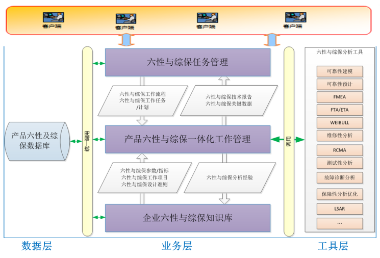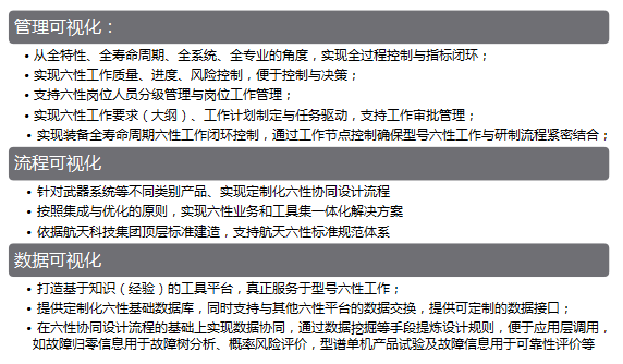 Ryun 基于武器装备立项论证、方案设计、工程研制、试验考核和定型评定六个阶段,以六性及综保标准规范为依据,以工作流程为引导,以六性论证工作为核心,收集整理现役型号历史数据信息以及不同系统的六性模型和评定方法,集成相关六性及综保工具,构建形成集指标转换、设计分析、研制过程监管、评估确认和数据分析等于一体的六性及综保一体化平台。