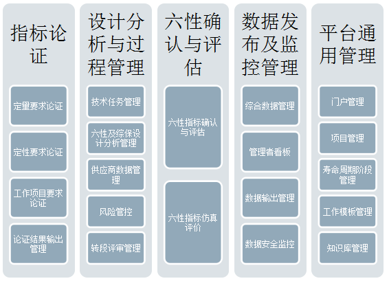从装备作战任务需求和使用剖面出发,转换形成六性及综保指标要求;基于明确的技术要求、工作计划要求,全程监管,通过提供规范的报告和数据模板和有针对性的检查单和复核复算等手段,监管、控制每个六性及综保工作项目的工作质量;利用积累的六性及综保试验验证和评价方法,为规划装备验证试验任务项目、制定试验大纲和方案、评价装备的六性及综保水平提供支撑。