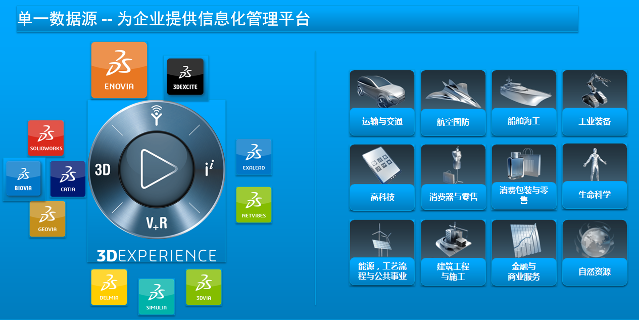 达索系统在全球重点围绕12个主打行业,涉及了航天航空、交通、机械制造、能源、消费品、高科技、银行和金融服务、自然资源和矿业等,覆盖了人们生活方方面面的领域。达索系统一直致力于为不同行业的用户提供具有行业属性的个性化的解决方案。